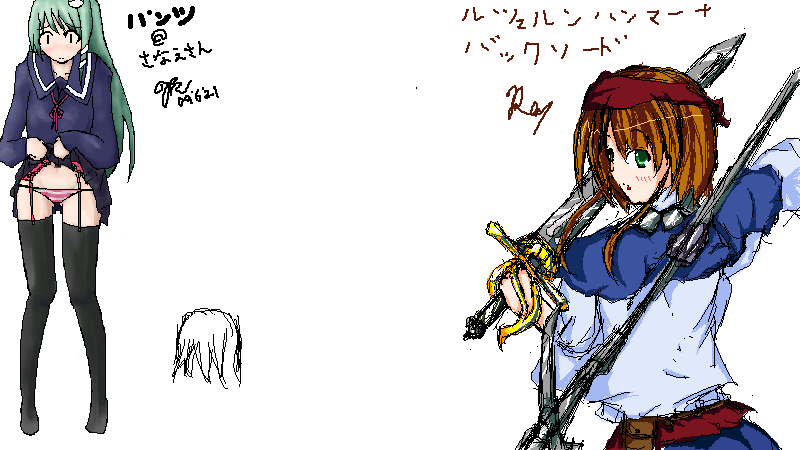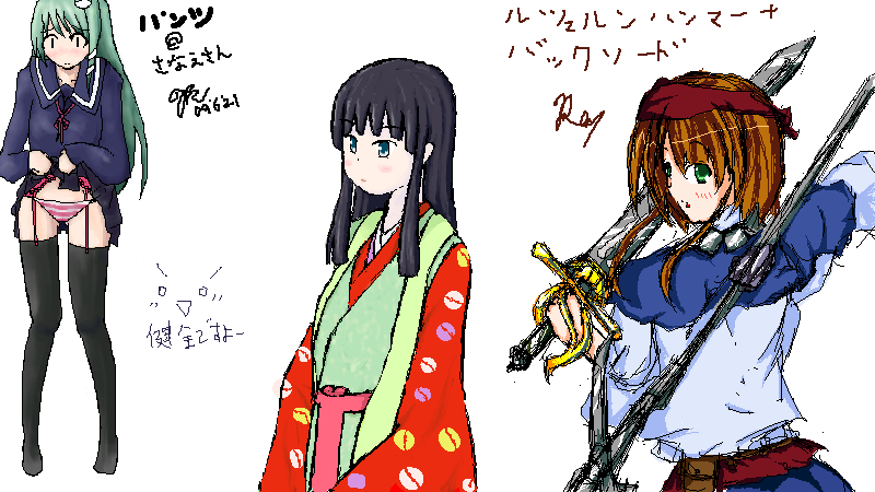 左から櫻木(パンツ)・鍔裟(十二単)・れい(武器)